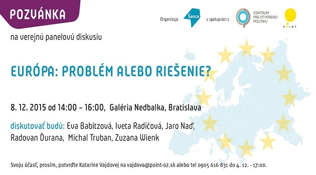 Diskusné podujatie s názvom Európa: problém alebo riešenie? je verejnou diskusiou o konkrétnych riešeniach, ktoré Slovensko ponúka na zachovanie Európy ako priestoru spoločných hodnôt, politík a pravidiel. Ponúkame týmto podujatím priestor na prezentáciu názorov, argumentov, skúseností a vízií špičkových predstaviteľov slovenského verejného života.